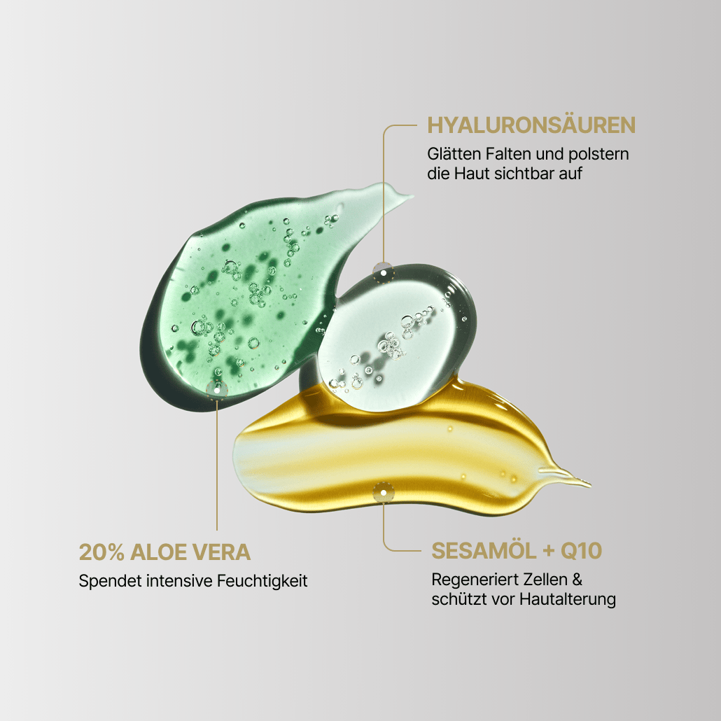 Hyaluronsäuren (lang- & kurzkettig): Wirken schnell und langanhaltend gegen Falten. Die Haut wird geglättet und erhält mehr Spannkraft für einen jugendlicheren Look.